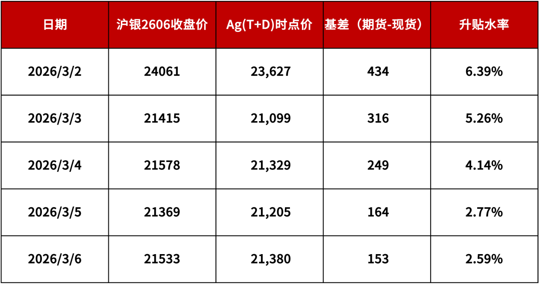 沪银主力合约与现货升贴水情况